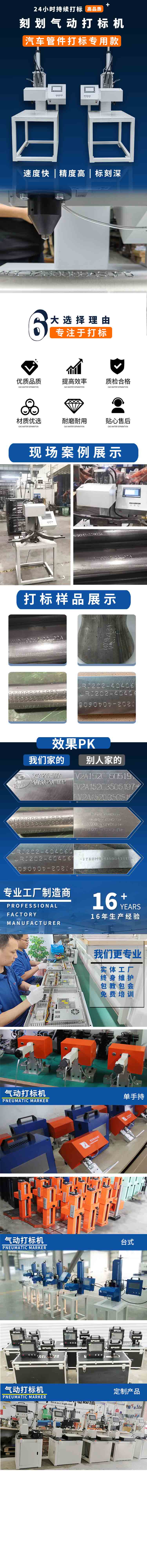 氣動劃刻機是氣動打標機的其中一種,刻劃是指用硬質合金或金剛石針在材料表面刻出文字和LOGO等,在圓面,平面,凹面或供面上刻出凹槽而形成連續(xù)直線,并且適用于任何材質。也被稱為“劃線”式打標。其適用于車架號、不銹鋼、法蘭、發(fā)動機號、銘牌、鋼瓶等多種行業(yè)加工,特別適用于對劃刻深度有特殊要求:如汽車VIN、鋼材熱處理前標識、閥門深度、石油管道標識等。