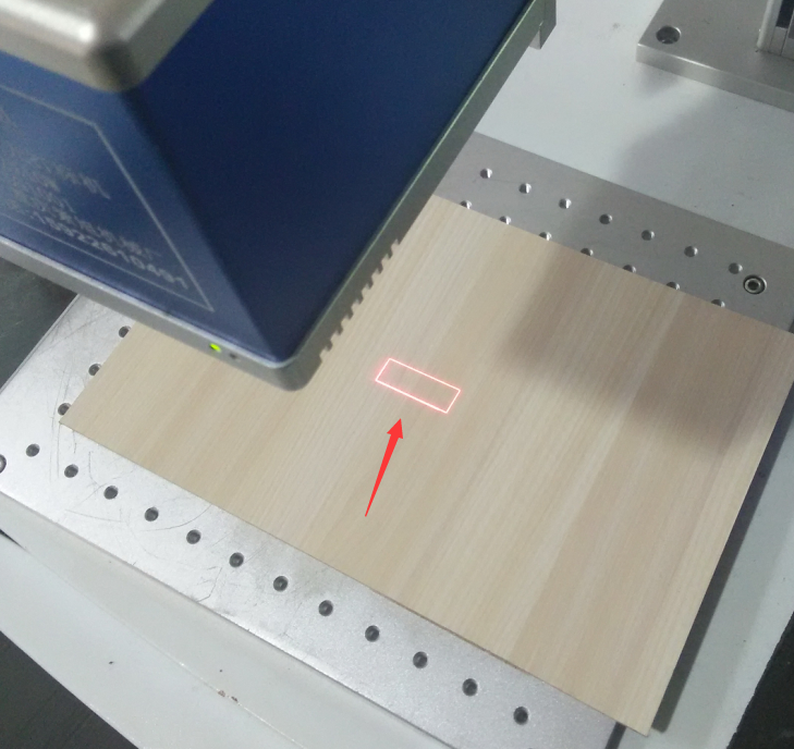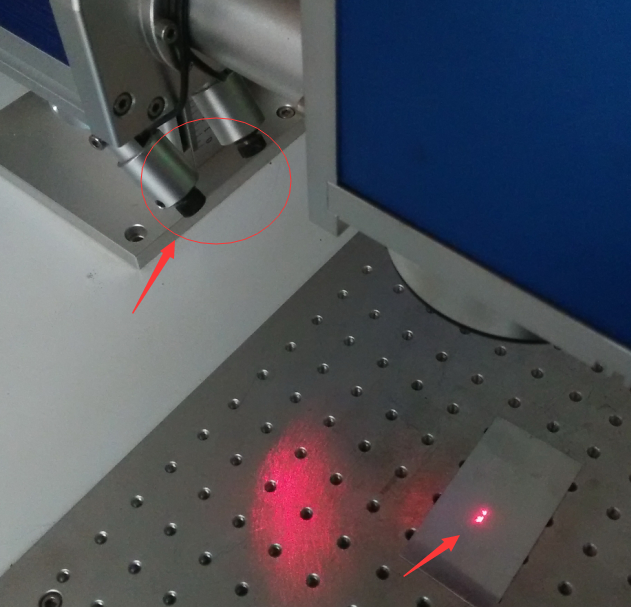 4) 在軟件中點(diǎn)擊打印,使用立柱頂端的升降調(diào)節(jié)把手調(diào)節(jié)高度(根據(jù)場鏡不同,大概高度在15~20CM不等),當(dāng)打印位置表面出現(xiàn)白色的光線即表示已找到到激光焦點(diǎn)