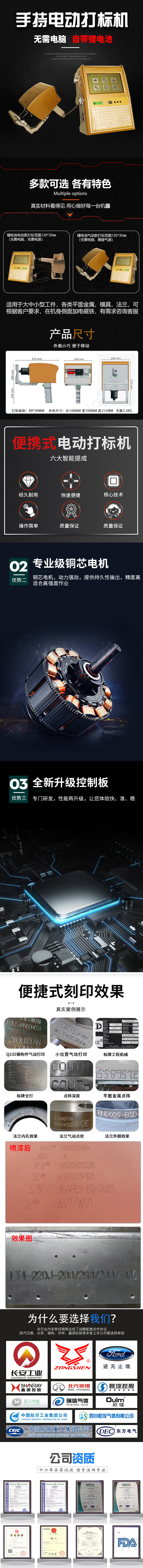 電動打標(biāo)機采用電磁為動能的方式代替氣動高頻微沖擊點陣打印,革命性的節(jié)省了氣源,同時大大降低了工作時的打印噪音,打印時無飛濺金屬粉塵;打印定位準(zhǔn)確,速度快;可廣泛應(yīng)用于汽車車身、鈑金件、銘牌等需要效果美觀、無需氣源、低噪音工作的場合,尤其適合鋁、銅、電鍍件、陽極化件等高檔產(chǎn)品的精美打標(biāo)。