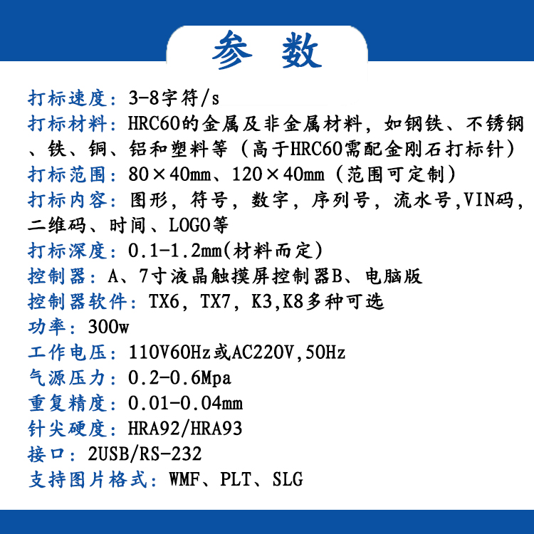 1、專用進口硬質(zhì)合金打標針,打標深度可達0.1-1.2mm(視材質(zhì)而定);