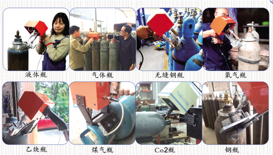 目前主要用于天燃氣鋼瓶、液化氣鋼瓶、氧氣鋼瓶、氮氣鋼瓶、乙炔鋼瓶、鋁瓶、滅火器瓶、民用鋼瓶、液體罐等各種鋼瓶進行字符打標(biāo)。